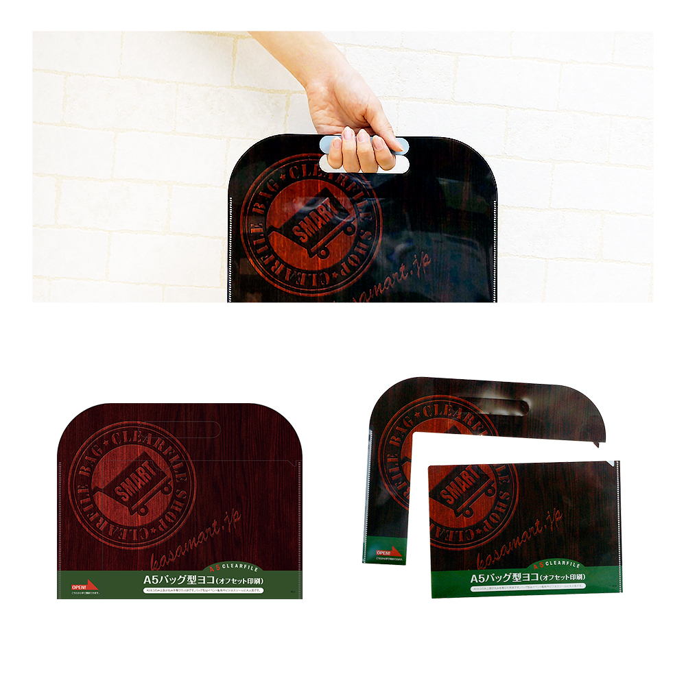 手提げバッグ型のクリアファイル。A5横長タイプ。
